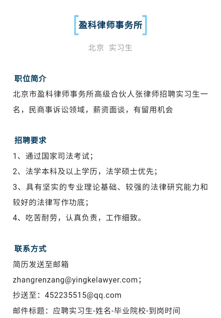 联系方式简历发送至邮箱zhangrenzang@yingkelawyer.com;