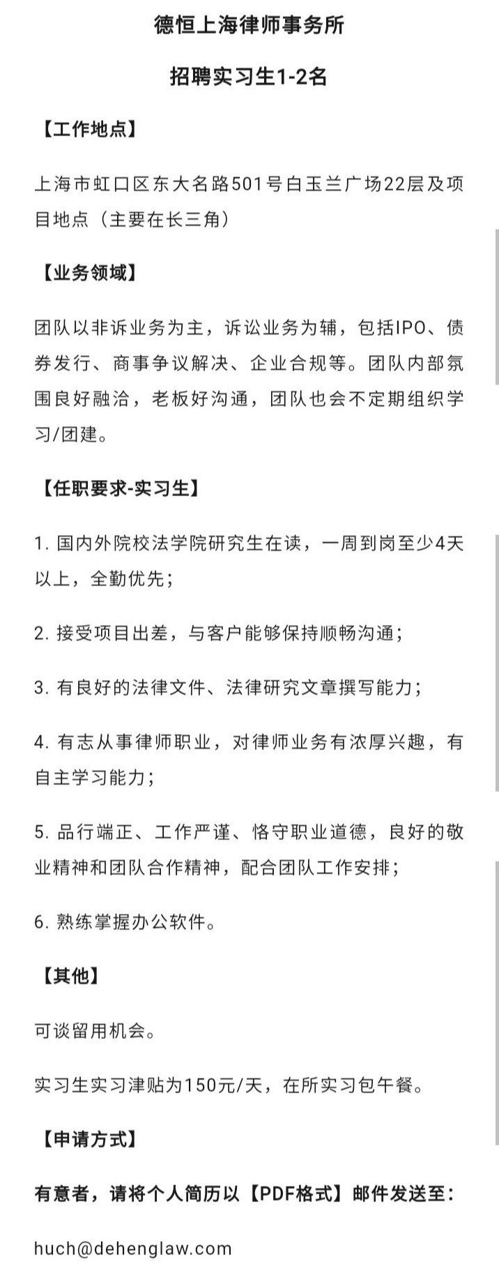 【申请方式】有意者,请将个人简历以【PDF格式】邮件发送至:huch@dehenglaw.com