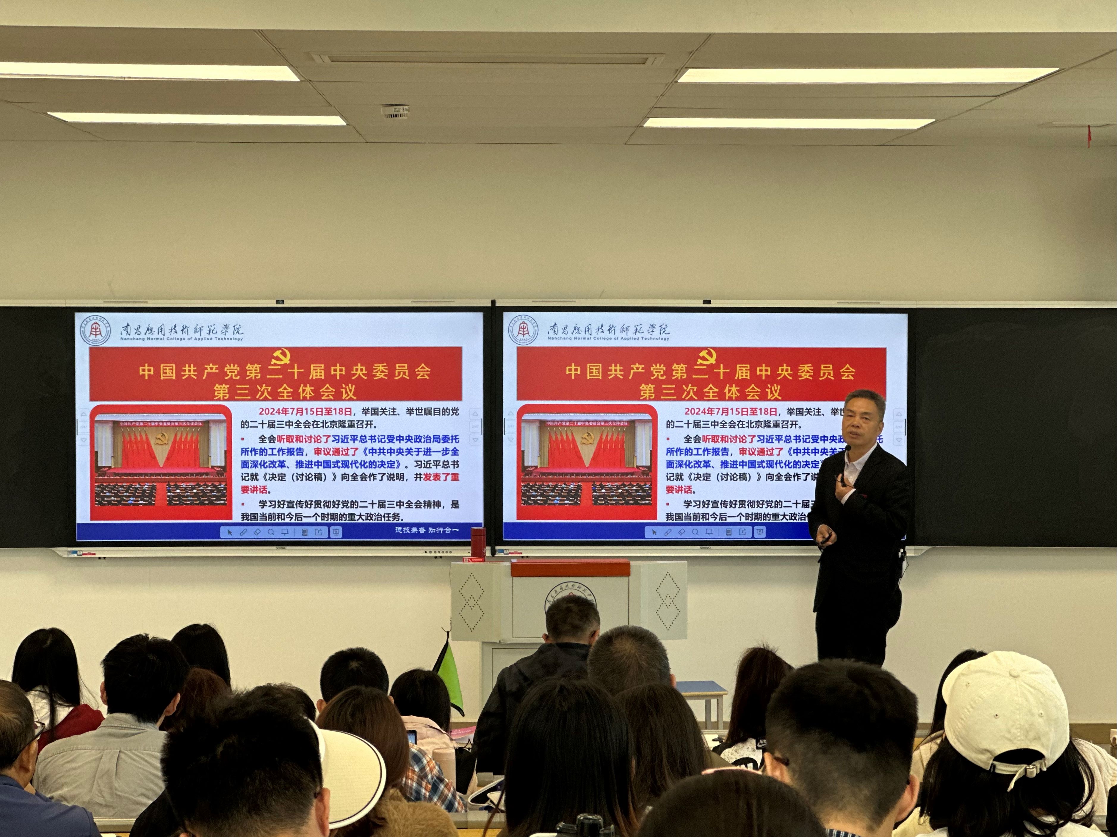 学习好贯彻好党的二十届三中全会精神,是当前和今后一个时期全党全国的一项重大政治任务。为全面深入学习宣传贯彻全会精神,教育引导广大党员干部师生自觉把思想和行动统一到全会精神上来,进一步把全会精神融入到教师课堂教学、科研和学生学习之中。10月22日,院长文道贵在沁苑7实B209教室,为学院全体思政课教师、行政人员,学生“星火”宣讲团成员、23级“星火班”学生等100余人进行党的二十届三中全会精神宣讲。宣讲会由副院长刘德彰主持。