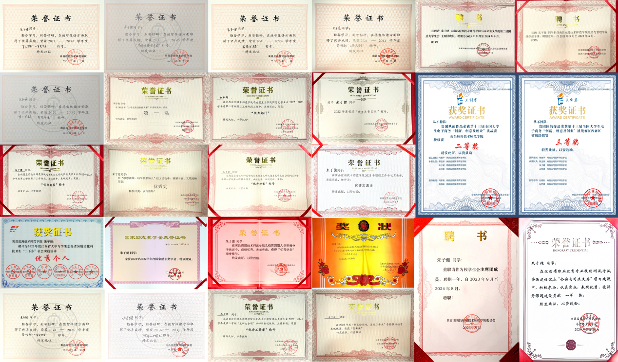 获国家奖学金、国家励志奖学金,获第十三届全国大学生电子商务“创新、创意及创业”挑战赛校级赛二等奖、江西赛区省级选拔赛三等奖。参与院级课题建设一次。获2023年江西省大中专学生志愿者暑期“三下乡”社会实践活动优秀实践团队、优秀个人,“强国有我、青春有为”暑期社会实践活动暨2023年“万名大学生进千站”文明实践志愿服务行动优秀实践成果、优秀个人。以第一作者身份参与撰写的调研报告《浅析山峰村党史学习教育发展现状及未来发展方向》入选此次优秀调研报告名单,并获二等奖。