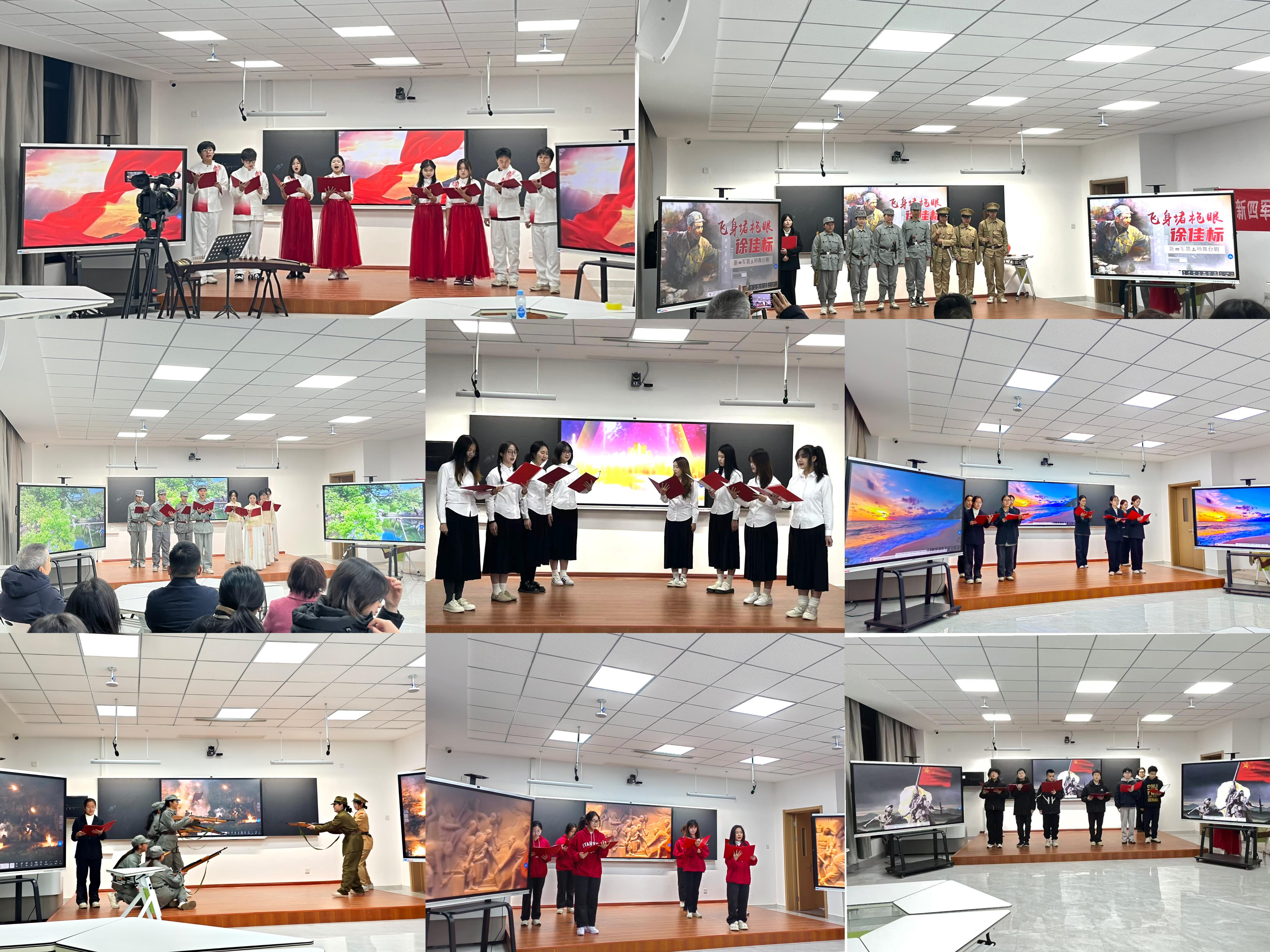 本次汇报展示活动完全由法学23级1班同学在王敬平教授等任课老师的指导下自编自导,由李司翰和戴璇同学主持。活动在全体师生激昂的《新四军军歌》合唱声中拉开帷幕。随后,同学们将所学转化为实践,以华中抗日根据地新四军七个师的传奇经历与英勇抗日斗争故事为蓝本,分7个小组自主创作并演绎了一系列精彩节目。从第1组的诗朗诵《烽火铁军魂—致新四军第一师》与歌唱《映山红》,到第2组的自创散文朗诵、《桃花谣》歌唱表演,到第3组舞台剧抗日英雄徐佳标的英雄事迹,从第5组朗诵+舞台剧《不朽》、第6组的朗诵《新四军赋》再到第7组的深情颂词《皖江的英雄儿女.七师颂》,每个节目都栩栩如生、精彩夺目,每句台词、每个表演环节都饱含着同学们对革命先辈为了国家和民族利益不屈不饶、英勇反抗外敌入侵的历史及其凝聚的新四军革命精神的深刻理解与高度敬佩。