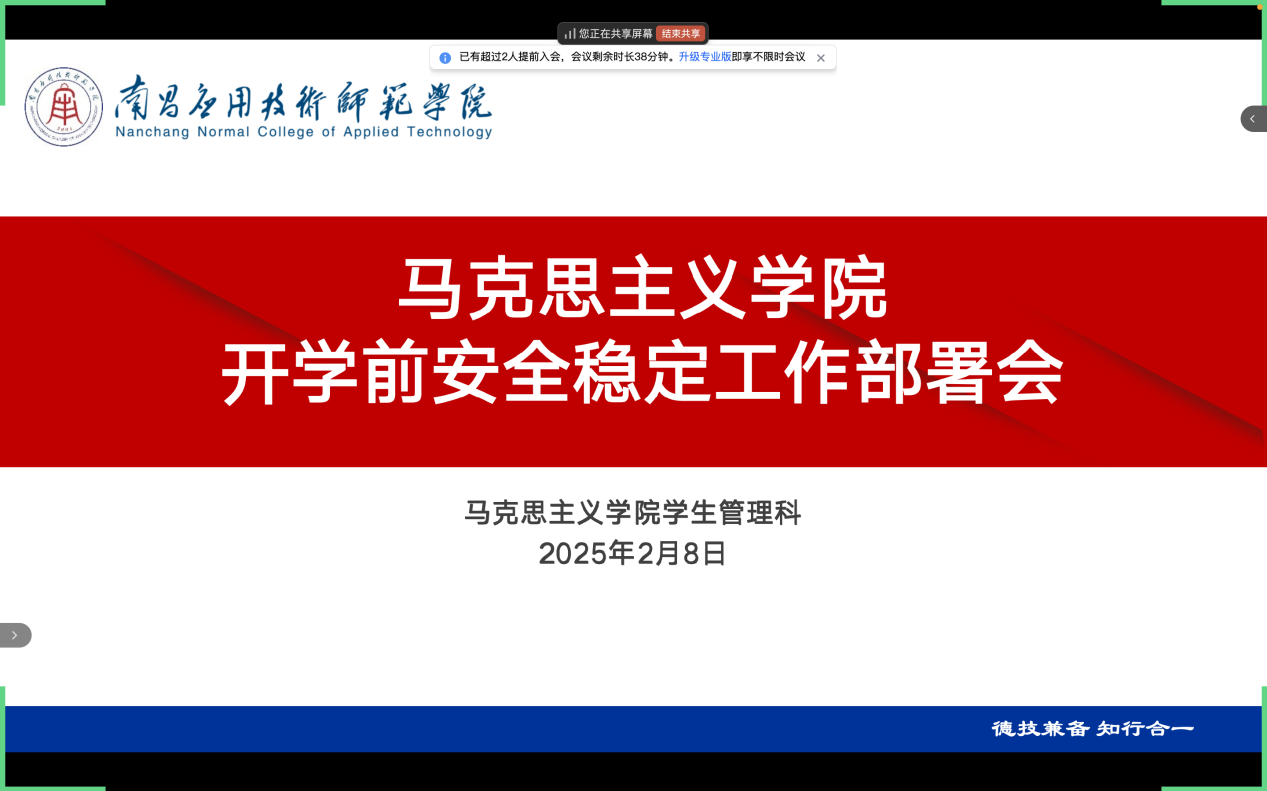 为切实做好新学期开学前的各项准备工作,确保学生安全返校,营造稳定有序的校园环境,williamhill官网于2月8日召开开学前安全稳定工作部署会,学院党总支书记张欣康、党总支副书记李婷、全体辅导员参会。
