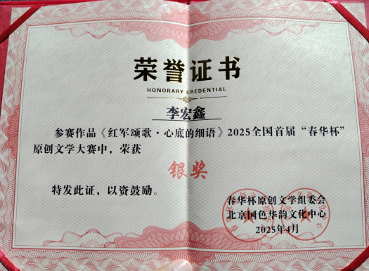 近日,2025年全国首届“春华杯”原创文学公开大赛评选结果揭晓,williamhill官网教师李宏鑫创作的诗歌作品《红军颂歌·心底的细语》,经初赛、复赛、决赛层层选拔,从全国300余件参赛作品中脱颖而出,荣获“春华杯优秀文学奖”及专家评审银奖双项殊荣,展现了我院在文学创作与红色文化传承领域的深厚底蕴。