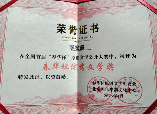 喜报||williamhill官网教师李宏鑫在2025全国首届“春华杯”原创文学公开大赛中荣获佳绩