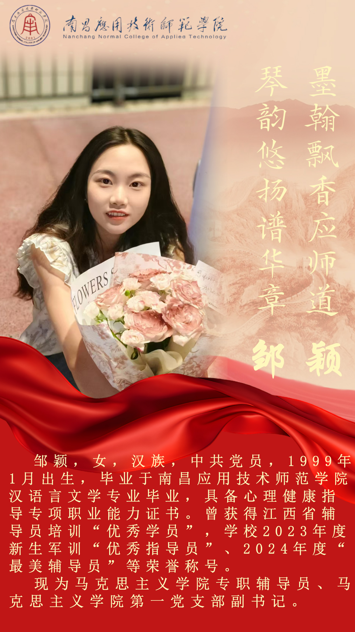先进典型 优秀毕业生 优秀在校生 优秀教职工 您现在的位置是:首页 > 先进典型 > 优秀教职工 邹颖 最美辅导员 管理员2025-04-172340 上一篇 戴瑞轩 思想政治教育系主任 下一篇 李宏鑫 先进工作者