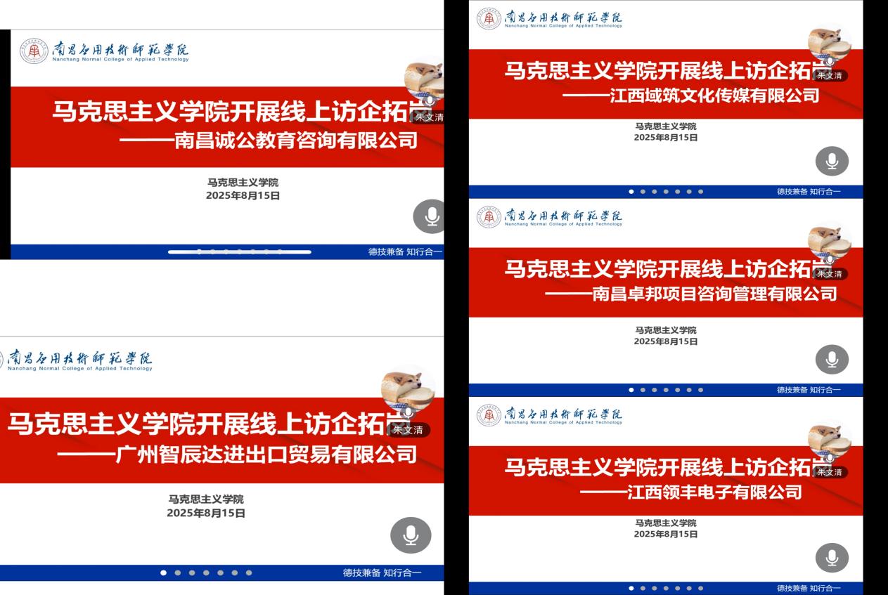 为拓宽毕业生就业渠道,强化校企合作,给学生提供更广阔的职业发展空间,8月15日,williamhill中国官方网站党总支书记张欣康通过视频形式对南昌诚公教育咨询有限公司、广州智辰达进出口贸易有限公司、江西域筑文化传媒有限公司、南昌卓邦项目咨询管理有限公司、江西领丰电子有限公司进行访问,双方就人才培养、实习实训、就业指导等方面进行了深入交流,并达成了一系列合作意向。