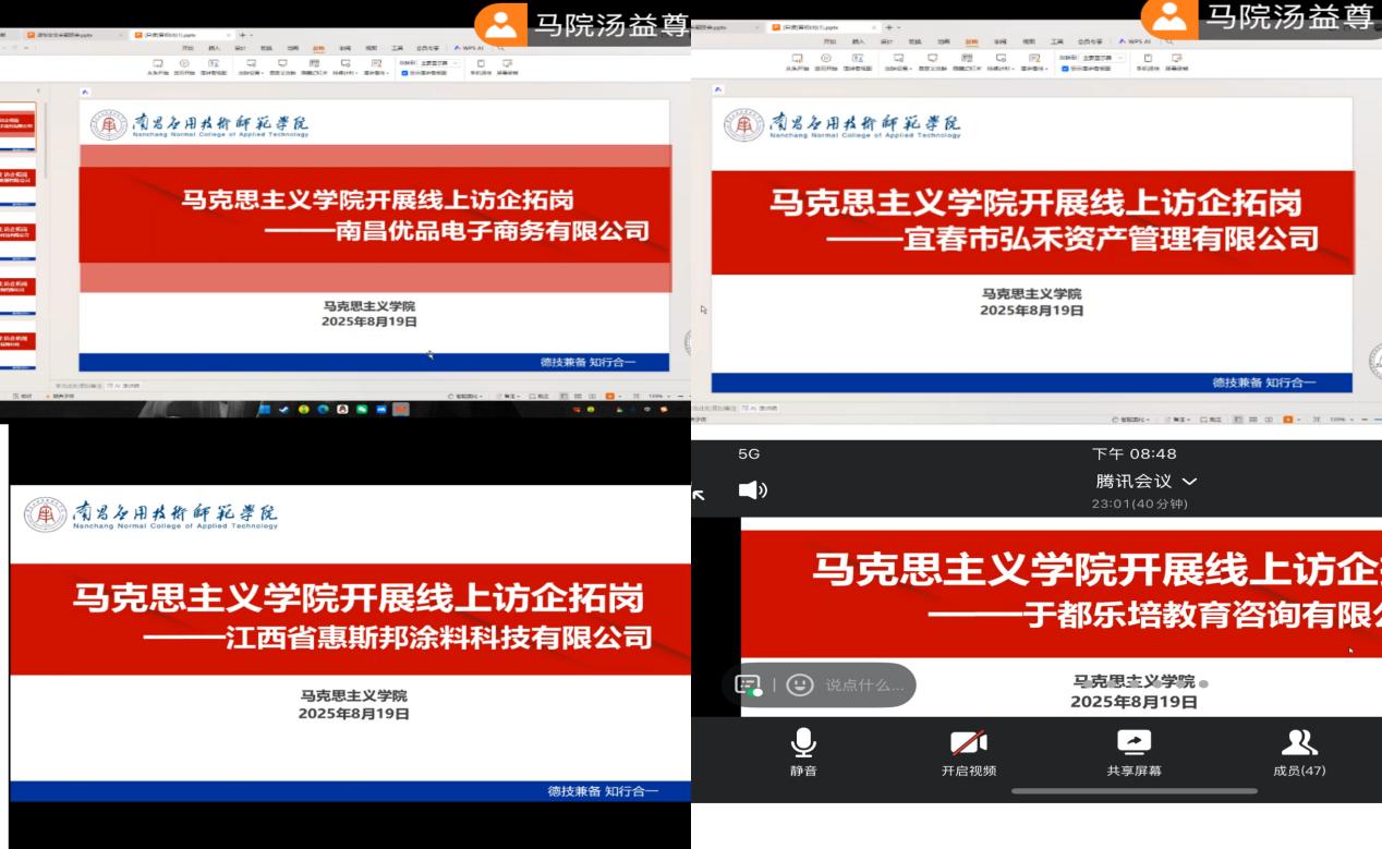 为进一步拓宽毕业生就业渠道,加强校企合作,促进学生高质量就业,williamhill中国官方网站于2025年8月19通过视频会议的方式与南昌优品电子商务有限公司、宜春市弘禾资产管理有限公司、江西省惠斯邦涂料科技有限公司、于都乐培教育咨询有限公司开展了线上访企拓岗活动。