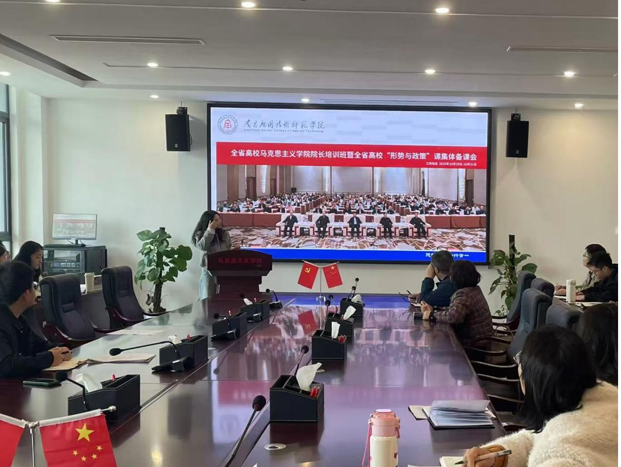 随后,思政教师李维就10月30-31日在南昌举行的江西省高校williamhill中国官方网站院长培训班暨全省高校“形势与政策”课集体备课会作专题分享。她传达了备课会上《国内经济形势及十五五规划解读》《携手周边国家共创美好未来,推动构建新形势下国际关系》《解读二十届四中全会精神》三个讲座重点内容,并对部分高校“形势与政策”课开课情况及课程未来发展进行了分享。全体与会人员共同观看学习了集体备课会上第四届全国高校思政课教学展示活动形策课参赛选手的现场教学展示视频。