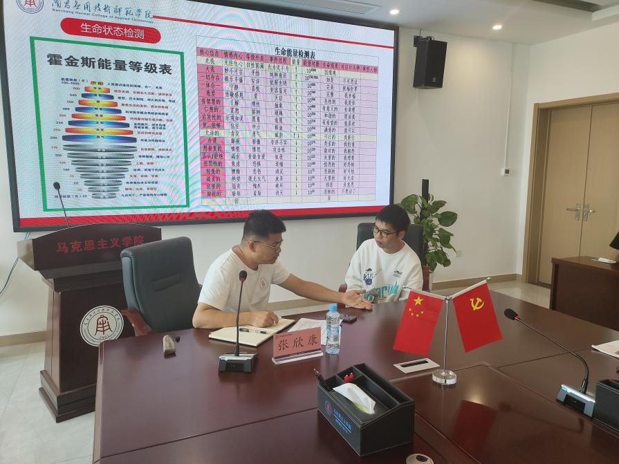 张欣康在大屏幕上展示出一张特殊的图片:一条蜿蜒的石板路,尽头有着光亮不太刺眼的太阳。他对李钦翰发出“是朝阳还是夕阳”的思考,耐心倾听,通过层层引导助力李钦翰“自我成长”。片刻后,李钦翰开口表达自我:“面对未来的道路我一直沉浸在理想化的状态之中,现实有差异后就变得沮丧颓废,现在我意识到了,我要先做才能有结果。”李钦翰从“放弃否定”走向“勇敢面对”,生命能量值也从50跃至200,同学们也响起热烈掌声。