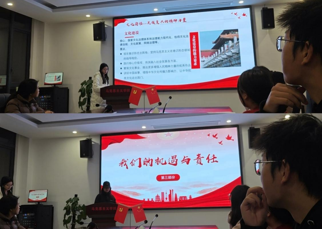 王毅与刘宇的宣讲串联起历史成就与未来展望,构成承前启后的奋进篇章。王毅以详实数据和典型案例为支撑,系统回顾“十四五”时期国家发展的辉煌答卷,让在场学子在成就回望中坚定发展信心。刘宇接过时代接力棒,聚焦“十五五”规划的战略部署,结合思政专业特色擘画青年发展机遇蓝图,更以学院“三下乡”社会实践、共青垦荒博物馆红色研学等鲜活事例,生动诠释“把个人理想融入国家发展江河”的实践路径,发出青年担当的时代号召。