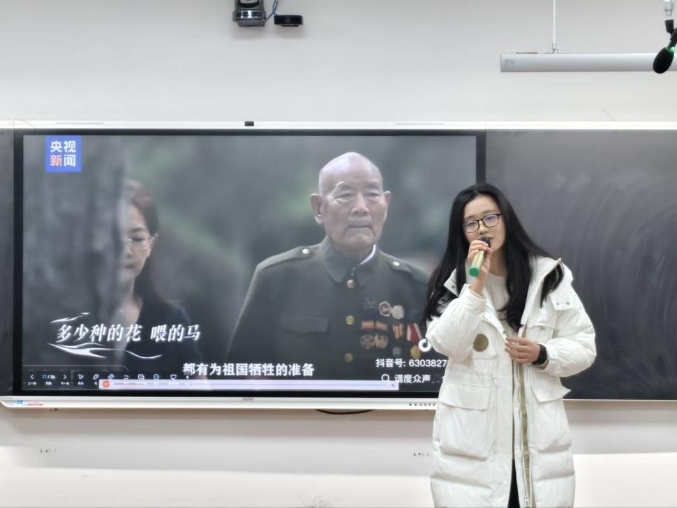 23 思政三班郑嘉琦以一首《铭记》,让深情的旋律在空间里流转,他用真挚饱满的演绎,让现场迅速沉浸在肃穆而动人的氛围中。